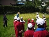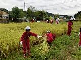 9月28日(月)の3校時に、全校児童で稲刈りをしました。5年生が中心となり、総合的な学習の時間で取り組んできました。地域ボランテシアの川島さんのお力を借りながら、今日の稲刈りの日になりました。稲刈りした米は、11月の学校公開日(