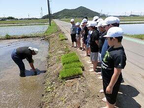5月28日、5年生はボランティアの先生にお世話になりながら、田植えに挑戦しました。田植えの方法を教わると、早速田んぼの中に稲を持って入りました。初めて田植えをする子ども達は、どんな感じなんだろうと心配していましたが、慣れてくると歓声を上げながら田んぼの感触を楽しんでいました。田植えの方も、はじめはぎこちない植え方でしたが、やればやるほど上手になっていきました。40分ほどかけて、30列分ほど稲を植えることができました。ボランティアの先生には、お忙しい中、大変お世話になりました。稲刈りまでの成長をしっかり見守っていきたいですね。
