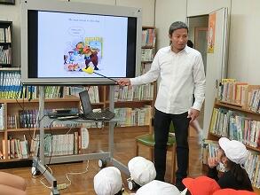 11月30日昼休みに図書室にて、ALTのロバート先生による読み聞かせがおこなわました。テレビを使っての読み聞かせで、すべて英語でのやりとりに子ども達は楽しそうに受け答えをしながら、笑いの耐えない時間でした。本校の図書室にも英語の本が何冊がありますが、手に取る子どもは、ほとんどいません。こういう時間を機に、英語に興味をもってもらえたらいいなーと感じました。