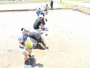 5月28日、5年生はボランティアの先生にお世話になりながら、田植えに挑戦しました。田植えの方法を教わると、早速田んぼの中に稲を持って入りました。初めて田植えをする子ども達は、どんな感じなんだろうと心配していましたが、慣れてくると歓声を上げながら田んぼの感触を楽しんでいました。田植えの方も、はじめはぎこちない植え方でしたが、やればやるほど上手になっていきました。40分ほどかけて、30列分ほど稲を植えることができました。ボランティアの先生には、お忙しい中、大変お世話になりました。稲刈りまでの成長をしっかり見守っていきたいですね。
