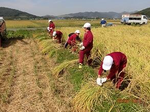 10月1日、5年生は稲刈りを実施しました。今回も田植え同様、地域のボランティアティーチャーさんに教わりながら、稲刈りに挑戦しました。のこぎり鎌の使い方を教わり、早速稲を刈っていきました。はじめは上手く刈れませんでしたが、コツをつかむと作業も上手になっていきました。刈りとった稲は、脱穀しやすいようわらを使って束にしばってきました。時間まで刈りとった後は、コンバインで脱穀をしていきました。1時間ほどがんばって刈った稲も、コンバインだとあっという間に脱穀し終わりました。あらためて機械のすごさが分かりました。ボランティアティーチャーさんには、貴重な体験をさせていただきありがとうございました。これからもよろしくお願いします。