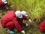 下級生も、鎌を上手に使って稲を刈っていました。また、上級生と協力して刈った稲を束ねることもしていました。みんなで食べる「喜多笑米(きたしょうまい)」が楽しみです。