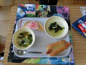4月12日、1年生がはじめての給食を食べました。今日の献立は、ピザドック、牛乳、ほうれんそうとしめじのソテー、野菜スープ、お祝いクレープでした。とてもおいしそうに、食べていました。