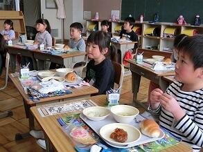 4月11日、1年生は初めての給食を食べました。まずは白衣の着方、配膳の仕方、手の洗い方など、給食の基本を教わりました。そして先生方に手伝ってもらいながら、配膳しました。「いただきます。」ご挨拶の後は、みんなで楽しく給食を食べました。初めての給食でしたが、ほとんどきちんと食べることができました。残さず食べて、元気な体を作りましょう。