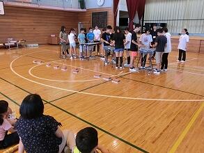 9月5日、第27回表現活動交流会を実施しました。学生さんが指導者となり、子ども達と身近にある楽器や道具などを使って、音づくりをする活動です。今回の活動では、学年別にテーマを設定し、音づくりに挑戦しました。1年生はいろいろなトライアングルを使って、2年生はキッチン道具、3年生はリコーダー、4年生はトガトン(フィリピンの竹楽器)、5年生が和太鼓など、6年生は鉄琴と木琴でした。発表会ではみんなの前で演奏を披露しました。どの学年も今回のテーマ、音の「くり返し」「(音の)呼びかけっこ」で音づくりができていました。活動後のふりかえりでは、音づくりが楽しかったという感想が多くありました。その後は学生さんとふれあい給食、共遊もしました。楽しい時間を過ごしました。2月に第28回目の表現活動交流会を実施する予定です。