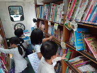 1年生にとっては初めての移動図書館。小学校の図書館にはない本も多く、何を借りようか目を輝かせていました。