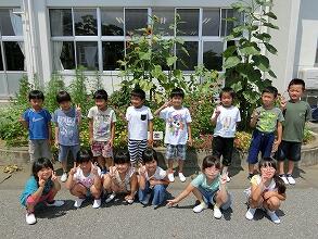 5月に植えた野菜の苗がぐんぐん成長して、たくさんの実をつけてくれました。収穫する2年生の顔は、みんなにこにこ笑顔です。