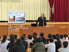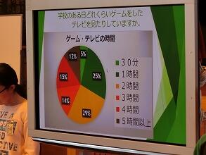 12月22日、保健委員会児童による、「睡眠時間について」の発表がありました。2年生以上のクラスに、睡眠時間に関するアンケートを実施し、その結果をまとめ考察したことを、全体の前で発表しました。この発表は5日の学校保健員会で行ったものですが、冬休み前に学校全体の子どもたちに、是非聞いてもらいたいと行った発表です。高学年になるほど睡眠時間が減り、ゲームをしたり、テレビを見たりする時間が多くなる傾向が分かりました。1日4時間以上テレビやゲームに接しているという結果も分かり、睡眠時間を適切にとらなければいけないと、委員会児童から提案がありました。この結果を、冬休みの生活に是非生かして欲しいですね。