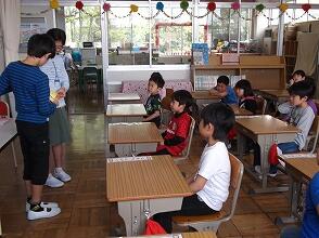 4月12日朝の時間、6年生から1年生に読み聞かせを行いました。「みずたまのたび」「いもころがし」「へんしんおてんき」を読みました。1年生は絵本の中に入り込んだように聞いていました。