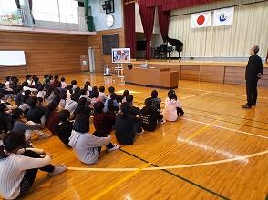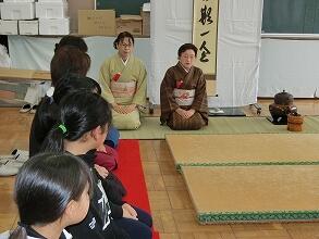 12月7日、6年生は茶道の体験をしました。岩舟地区にお住まいの茶道家の先生とそのお弟子さん方にお世話になり、お作法やお茶の点て方などを学びました。初めて口にする抹茶は、少し苦かったですが、とても味わい深いものでした。緊張しながらいただきました。また、お茶と一緒に和菓子もいただきました。苦みを感じたあとだけに、ほのかに甘い和菓子が、とてもおいしく感じられました。お忙しい中ご指導いただいた先生方、ありがとうございました。日本古来のお作法を学んだ、貴重な時間となりました。