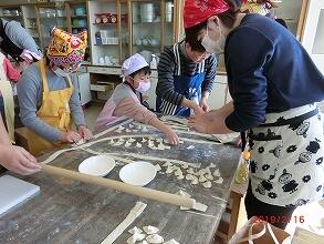 2月16日(土)休日ボランティアによる耳うどん作りが行われました。耳うどんは、その形が「耳」に似ていることから「耳うどん」とよばれている佐野市の郷土料理で、その耳うどんを食べると、一年中悪いことが聞こえないですむと言われているそうです。作り方は、地粉に水と塩を入れて、よくこねる、そしてのばして、切る。切ったものを耳の形にして、ゆでる。ゆでた後は、温かいお汁の中に入れて、少し煮たらできあがりです。また、耳の形にできなかったうどんの切れ端は、ゆでた後に、きなこと黒蜜をかけて食べました。みんな楽しそうに、耳うどんを作っていました。最後は、できた耳うどんをみんなで食べました。とてもおいしかったです。休日ボランティアの皆様ありがとうございました。