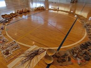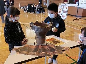 2月21日國學院大學栃木短期大学の学生との表現活動交流会が行われました。今回は,縄文土器の文様をもとに音楽づくりをしようという内容で行いました。縄文時代にあった自然物(アズキ、エゴマ、クルミ、クリ、石、木の枝、鹿の角)などで音を出してみたりしました。あじさいっ子班にわかれて、音楽をつくり、発表もしました。本物の縄文土器にも触れることができ、とても楽しく貴重な時間になりました。