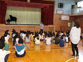 今年度、はじめての音楽集会が体育館で行われました。学校運営委員の方々が見守る中、新1年生に校歌を覚えてもらうために、校歌の練習をしました。まずは、歌う姿勢から勉強をして、声の出し方、歌い方を勉強しました。2~6年生の子ども達は、大きな声で素敵な歌声を体育館に響かせていました。