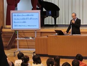 1月28日、給食週間の行事の一つ、調理員さんへの感謝会を開きました。感謝の手紙を朗読したり、みんなが書いた手紙を渡したりと、いつもお世話になっている調理員さんへ、感謝の気持ちを伝えました。調理員さんからは、これからも一生懸命給食を作るので、残さず食べてくださいとお話もいただきました。最後に校長先生からは、給食はたくさんの人たちが関わってわたしたちのもとへ届くことを教えていただきました。これからも感謝の気持ちを忘れずに、給食をいただきましょう。