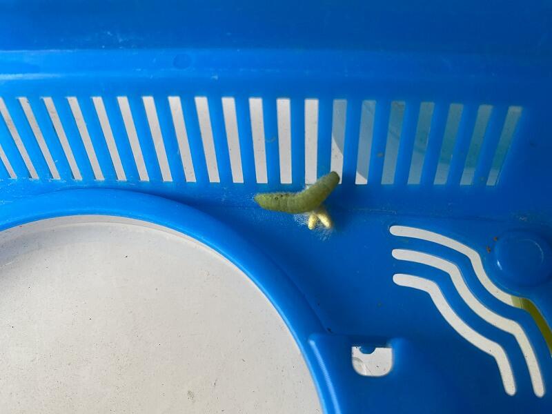 5月21日・22日の生き物の様子をお知らせします。アルバムの写真も見てくださいね。この写真は○○ムシ○○○バチにたまごを産み付けられたよう虫の様子です。自然にはこういうこともあります。右は22日の空の写真です。天気は○○○ですね。なぜなら……だからです。