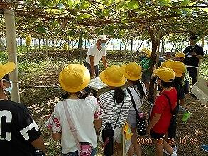 10月2日、3年生はぶどう農家見学、5年生は稲刈りと校外学習を実施しました。3年生は毎年お世話になっているぶどう農家ボランティアさんに、その仕事についてのお話を伺いました。ぶどう棚の中に案内され、ぶどう畑の様子を見ながらのお話は、とても興味深かったです。たくさんの質問にも答えていただきました。最後にぶどうのお土産までいただき、3年生のみんなは大喜びでした。
