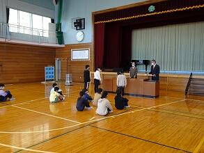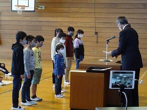 12月25日、第2学期終業式を実施しました。まずは学校長のお話です。2学期の目当てのは、①自分から進んで取り組もう、②みんなで力を合わせよう、③健康に気をつけよう、の3つです。学校長が作ったスライドを見ながら、振り返りをしました。2学期は、感染症対策をしながらでしたが、いろいろな行事を実施することができました。どの行事でも、子ども達の元気と笑顔が見られました。実施に当たりご協力いただいた保護者の皆様、地域の皆様、あらためてお礼申し上げます。また、終業式後には表彰も行いました。学校長、教頭がクラスを回って賞状を伝達しました。受賞した皆さん、おめでとうございます。また、給食の時間をつかって児童代表の作文発表も行いました。24日に、4年生代表の2人、25日は、2年生と6年生の代表2人が2学期の振り返りを発表しました。4人ともしっかりと振り返りと3学期に向けての抱負を発表できました。1月7日まで冬休みとなります。児童の皆さん健康と安全に気をつけて、有意義な休みにしましょう。保護者の皆様、地域の皆様どうぞよいお年を迎えてください。