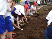 みんなで協力して、学年ごとに三種類のお花を植えました。花壇が綺麗になり、週末の運動会も気持ちよく迎えられそうです。