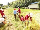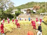 3校時目には、秋晴れとなり、赤とんぼが稲穂の上を飛び交う中、稲刈りをすることができました。今年も川島様に、鎌での稲の刈り方、稲わらを使った束ね方を教えていただきました。2年生以上は経験者とあって鎌使いがとても上手でした。そして、2年生でも自分で稲を刈り、自分で束ね、竿にかける姿も見られました。今年は、2本の竿がないとかけられないくらいの豊作となりました。このまま天日干しをして3週間後には、脱穀の予定です。