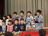 今年一年間、朝の登校見守りをはじめ学習や体験活動のボランティアとしてお世話になってきました皆様をお招きして、学校公開日とあわせてボランティアさんへの感謝の会を開催いたしました。ボランティアさんに御指導いただいてきた5年生の米作りに関する発表や全校生による子ども落語「まんじゅうこわい」の発表を行いました。その後、年間をとおして全校生が取り組んできました一輪車の演技を御覧になっていただきました。そして最後には、版画印刷したカレンダーとお花のプレゼントをしました。また、全校児童と職員そして保護者の皆様とボランティアの皆様を囲んでふれあい給食も催し、おいしい給食をいただきながら交流を深めました。少しでも感謝の気持ちが児童の発表や演技からボランティアの皆様にお届けすることができていましたら幸いです。児童・職員一同、本当にお世話になりました。ありがとうございました。