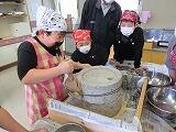 初めての体験に、わくわくしながら取り組みました。実際に回してみると、子どもたちが思っていたよりさらに重く、両手で力をこめて回しました。石うすを貸してくださったボランティアの中田睦夫さんのお話によると、石うすまわしは夜なべ仕事だったそうです・・・。子どもたちは驚いていました。