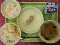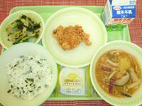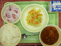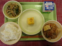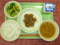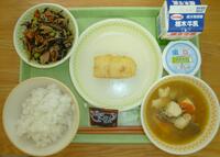 6月5日(月)の給食は、ご飯、牛乳、いか天丼の具、ひじきの煮物、豚汁、歯と口の健康週間ゼリーです。
