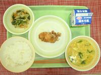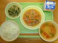 6月16日(金)の給食は、「とち介ランチ」で、ご飯、牛乳、栃木市産豚肉の新・しょうが焼き、ほうれん草のナムル、トマトと卵のスープです。お米、豚肉、にんじん、たまねぎ、もやし、トマトは栃木市産です。