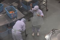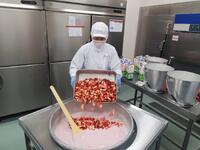 今までの学校給食では、野菜やフルーツは、衛生管理の観点から加熱したジャムやペースト、ゼリーでしか提供できませんでした。大平学校給食センターでは、国の補助金をいただいて特別な装置を購入し、いちごやカクテルトマト、きゅうりなどを加熱しないで安全でおいしく提供できるようになりました。今年度の予定としては、6月からサラダなどに使用するきゅうりは全て生きゅうりを提供していきます。また、大平産のぶどうなども提供していきます。