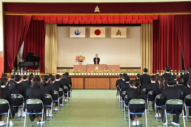 1月31日(金)多目的室において「立志式」を行いました。2学年生徒、職員、保護者で集まり、感動的な立志式となりました。校長式辞に始まり、県知事メッセージ披露、生徒代表による作文発表、記念品授与、これまでの2年間を振り返る動画と小学校や中学校の恩師からのメッセージも流れました。生徒の中には涙を流す者もいて、過去を振り返り、未来に向かって一歩を踏み出そうとする思いを新たにしていました。保護者の皆様にもたくさんご参加いただき、ありがとうございました。