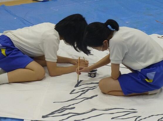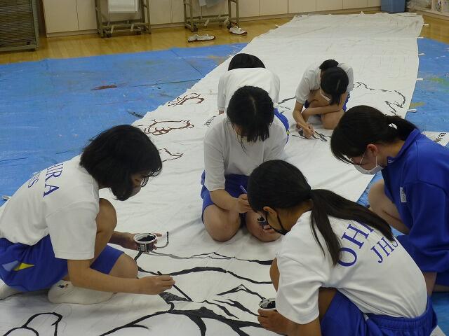 文化部の生徒により,運動会の横断幕の制作がはじまりました。まだ制作の途中ですが,縦1.8メートル,横10メートルに描かれたデザインからはとても迫力が感じられました。部員一丸となって制作した思いを受け,当日はさらに盛り上がりを見せるでしょう。是非,会場で完成した力作を鑑賞してください。