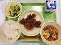今日の給食は、コーン茶飯、牛乳、冷やっこ(タレ付き)、海藻サラダ、インド煮です。