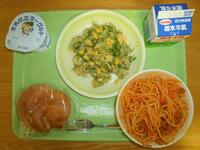 6月15日(木)の給食は、苺の栃木市産米粉パン、牛乳、トマトとベーコンのスパゲティ、おかひじきのサラダ、栃木県産ヨーグルトです。
