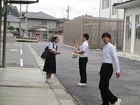2年生が職場体験学習の各事業所との打合せに行きました。昇降口で確認を行い,グループごとに体験先に向け出発しました。
