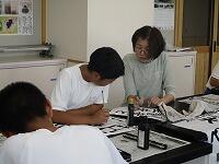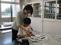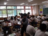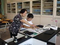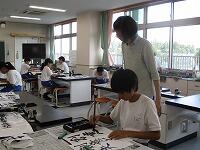 地域のボランティアの方を招いて,1年生の書道の授業を行いました。1クラスを2つの部屋に分け,少人数による丁寧な指導を行っていただきました。
