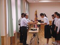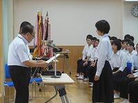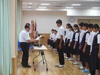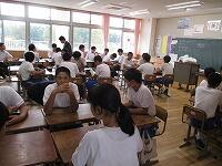 第1学期終業式を行いました。本校では,全生徒が入れる空調設備のある多目的室があり,猛暑の中ですが,涼しい環境で行うことができます。学校長の式辞に続き,各学年の代表の生徒が1学期の反省を発表しました。