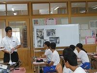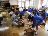 1年生の技術科では木材加工を行っています。地域のボランティアの方がのこぎりの使い方についてご指導くださいました。一人ひとりに丁寧に教えていただきました。