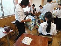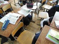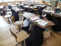 Jアラート訓練用音源を利用し,弾道ミサイルを想定した対応行動訓練を実施しました。生徒はカーテンを閉め,窓際に机を移動し,その下に体を入れて身を守る姿勢をつくりました。