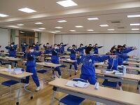 1年生の保健体育の授業のようすです。現在弓道を行っており,弓道部の生徒がていねいに他の生徒に教えています。