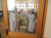 給食を再開しました。感染症感染防止対策として,これまで以上に細かな点まで配慮しています。給食の準備のようすです。