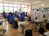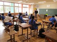 学校が再開しました。昇降口で体調チェック表で健康状態を確認しています。また,教室は机の間隔を可能な限り広くしています。久しぶりの学校で,友達に会えてうれしそうな生徒が多く見られました。