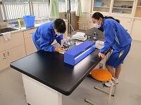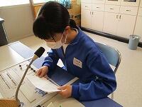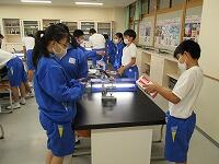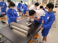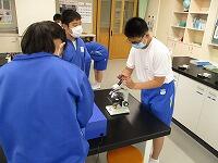 1年生の理科の授業のようすです。顕微鏡を使い学習しています。感染症予防の観点から,接眼レンズに直接目がつかないように,ラップを巻いて使用しています。
