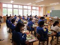 1年生の給食のようすです。手際よく準備ができるようになってきました。食事中は会話をしないように心がけ,給食のおいしさを味わっています。