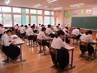 期末テストが始まりました。今年度は修学旅行の日程の都合で,今週は3年生,来週は1,2年生が期末テストを行います。3年生は問題を一生懸命解いていました。