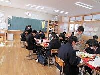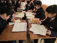 3校時、1年2組で、国語の研究授業を済田先生が行いました。今日の授業のねらいは「書いた意見文を互いに読み合い、感想を交換する」でした。