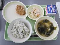 給食週間最終日のメニューは、大平西小学校リクエストメニューでした。小松菜とじゃこのご飯、鶏肉の唐揚げ、根菜入りポテトサラダ、大根と豆腐の味噌汁、牛乳でした。ご飯が、おいしく炊けていました。