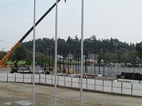 今日は勤労感謝の日ですが、校庭の工事は行われていました。体育館南に建設予定の外トイレと体育器具置場も柱が立ちました。