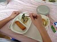 給食の八宝菜も、名前のようにとてもおいしかったですよ。写真は2年1組の給食の様子です。