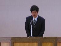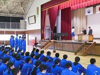 新任式で,7名の先生方が生徒の前であいさつをしました。最後に代表の生徒が歓迎の言葉を述べました。