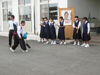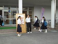 生活委員会によるあいさつ運動のようすです。登校時に昇降口前で大きな声であいさつをしています。それに伴い,登校した生徒も,いつもより大きな声であいさつをしています。