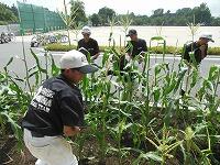 本日は雨のためダイヤモンドが使えず,校庭の水たまりのないところで練習を行いました。その後,学校の花壇で育てた,インゲン豆,枝豆,トウモロコシなどを収穫しました。